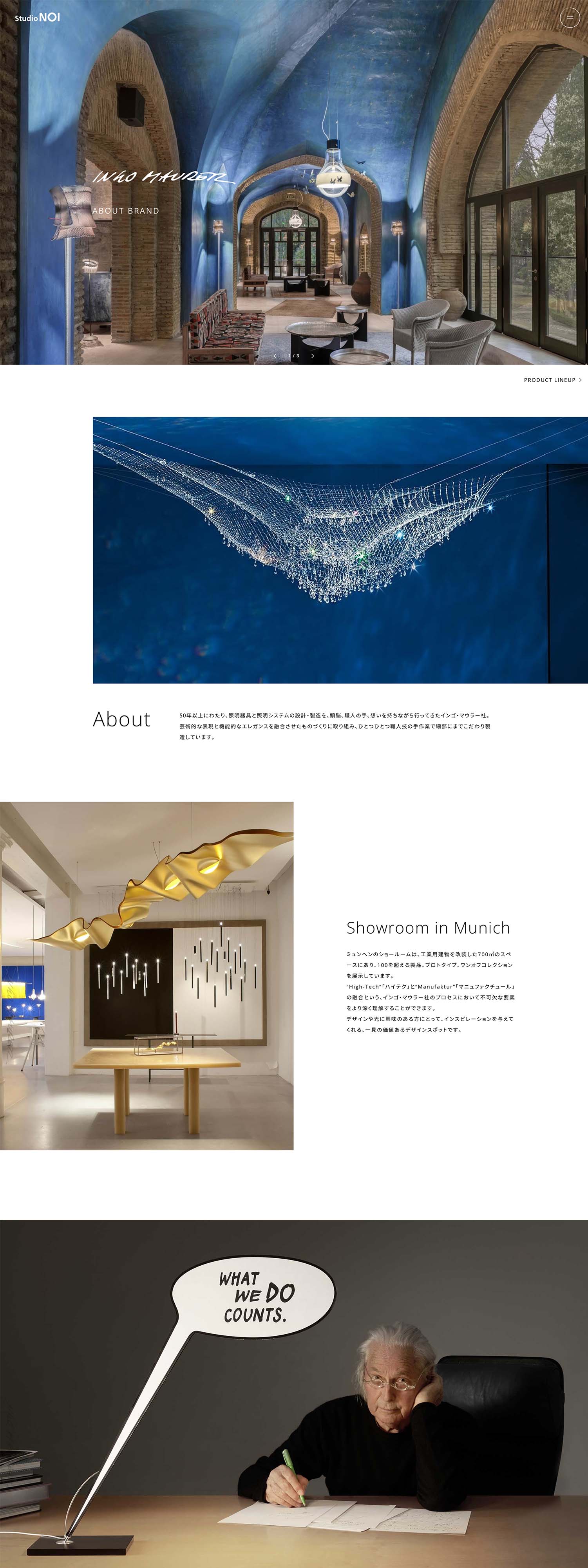 ●案件概要 海外の4つの照明ブランドを取り扱う日本代理店のサイトリニューアルを担当いたしました。 このプロジェクトでは、高価格帯かつアーティスティックな照明器具を扱うため、商品自体が際立つように、できる限り装飾を抑えたミニマルで洗練されたデザインを採用しました。装飾を削ぎ落とすことで、個性的な照明の存在感を引き立たせています。 また、豊富な商品ラインナップを快適に閲覧できるように、カタログサイトとしての視認性と操作性を重視したUI設計を行い、ユーザーがスムーズに商品を探せる構成を意識しました。